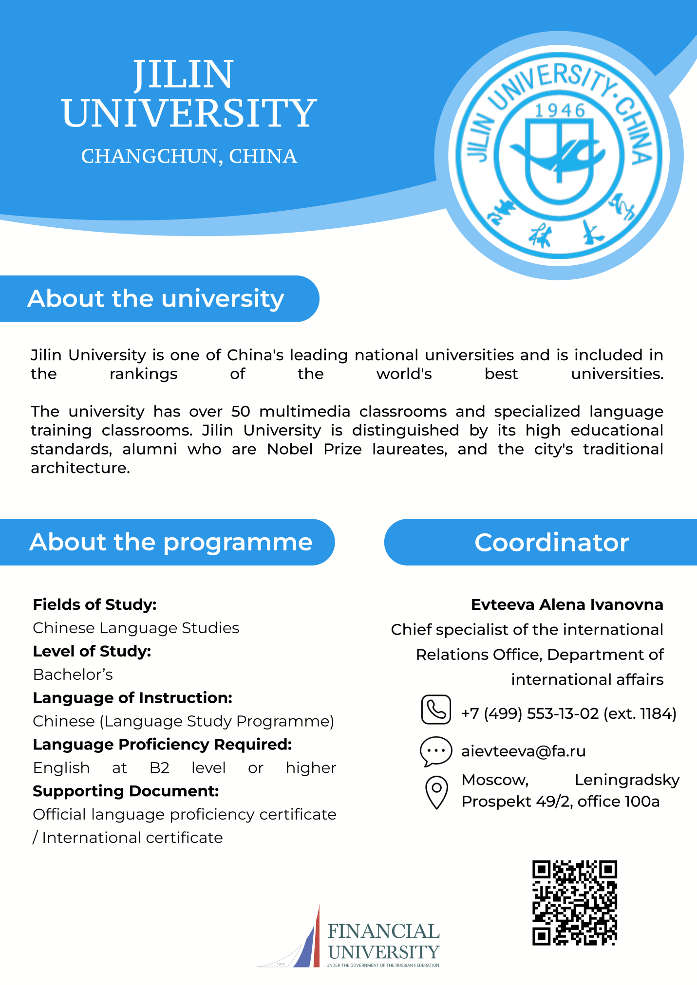 | International Economics and Trade (with Advanced Studies in Chinese Economy and Language)Partner University: Jilin University (China)Target Audience: Third-year bachelor’s students enrolled in the "International Economics and Trade (with Advanced Studies in Chinese Economy and Language)" program at the Faculty of International Economic Relations Language of Instruction: English / Chinese Tuition Fees: Free within available quotas Deadline for submission: to be specified Academic coordinator: Marina A. Amurskaya, Head of the Department of International Business +7 (499) 943-9493 MAAmurskaya@fa.ru Administrative coordinator: Alyona I. Evteeva, Chief Specialist of the Department of International Relations of the Department of International Activities +7 (499) 553-1302 AIEvteeva@fa.ru Jilin University (Bachelor's Program) |