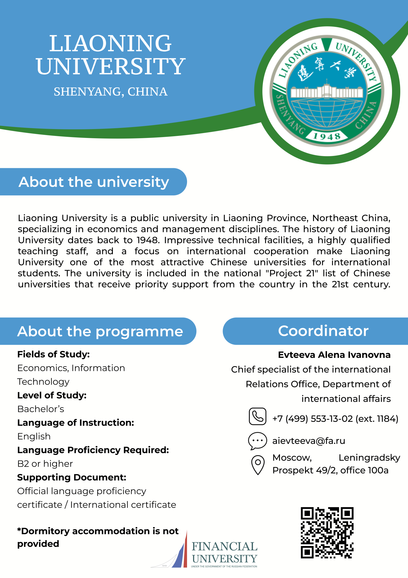 Target Audience: Second-year bachelor’s students enrolled in the "Global Politics" program at the Faculty of Social Sciences and Mass Communications Language of Instruction: English and Chinese Tuition Fees: Free within quota limits; additional spots are paid Submission deadline: to be specified Academic coordinator: Daria D. Osinina, Deputy Dean of the Faculty of Social Sciences and Mass Communications for Russian and International Partnerships +7 (499) 553-1337 DDOsinina@fa.ru Administrative coordinator: Alyona I. Evteeva, Chief Specialist of the International Relations Department of the Office of International Activities +7 (499) 553-1302 AIEvteeva@fa.ru Liaoning University: Global Politics Program Details (PDF) |