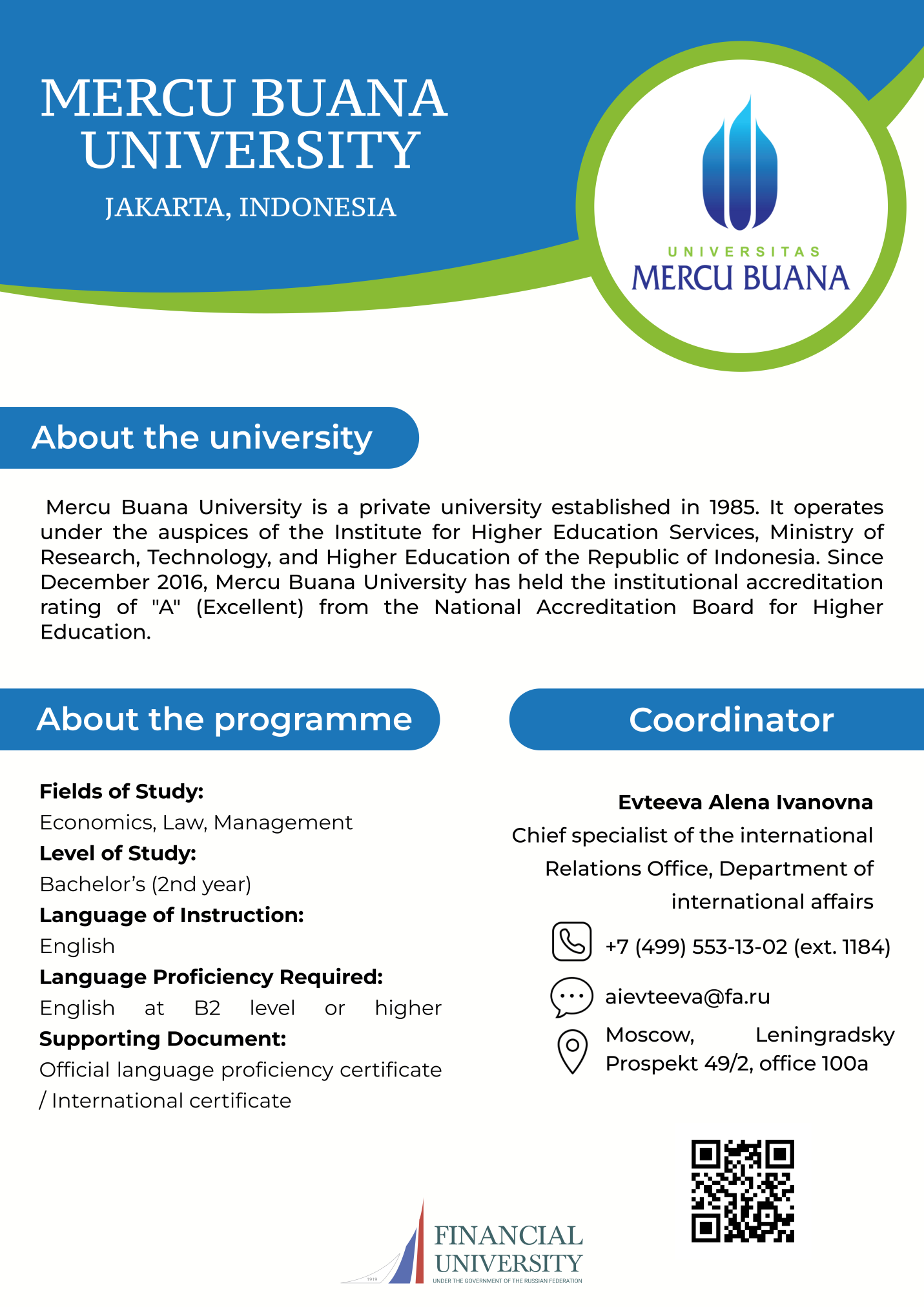 | Economics and Business of Eastern Countries Partner University: Merku Buana University (Indonesia)Target Audience: 2nd year undergraduate students of FMEDU Language of instruction: English Tuition fees: free of charge within the framework of quotas Deadline for submission: to be specified Academic coordinator: Marina A. Amurskaya, Head of the Department of International Business +7 (499) 943-9493 MAAmurskaya@fa.ru Administrative Coordinator: Elizaveta Y, Mits, Chief Specialist of the International Relations Department of the International Activities Directorate +7 (499) 553-1293 EYMits@fa.ru Merku Buana University (PDF) |