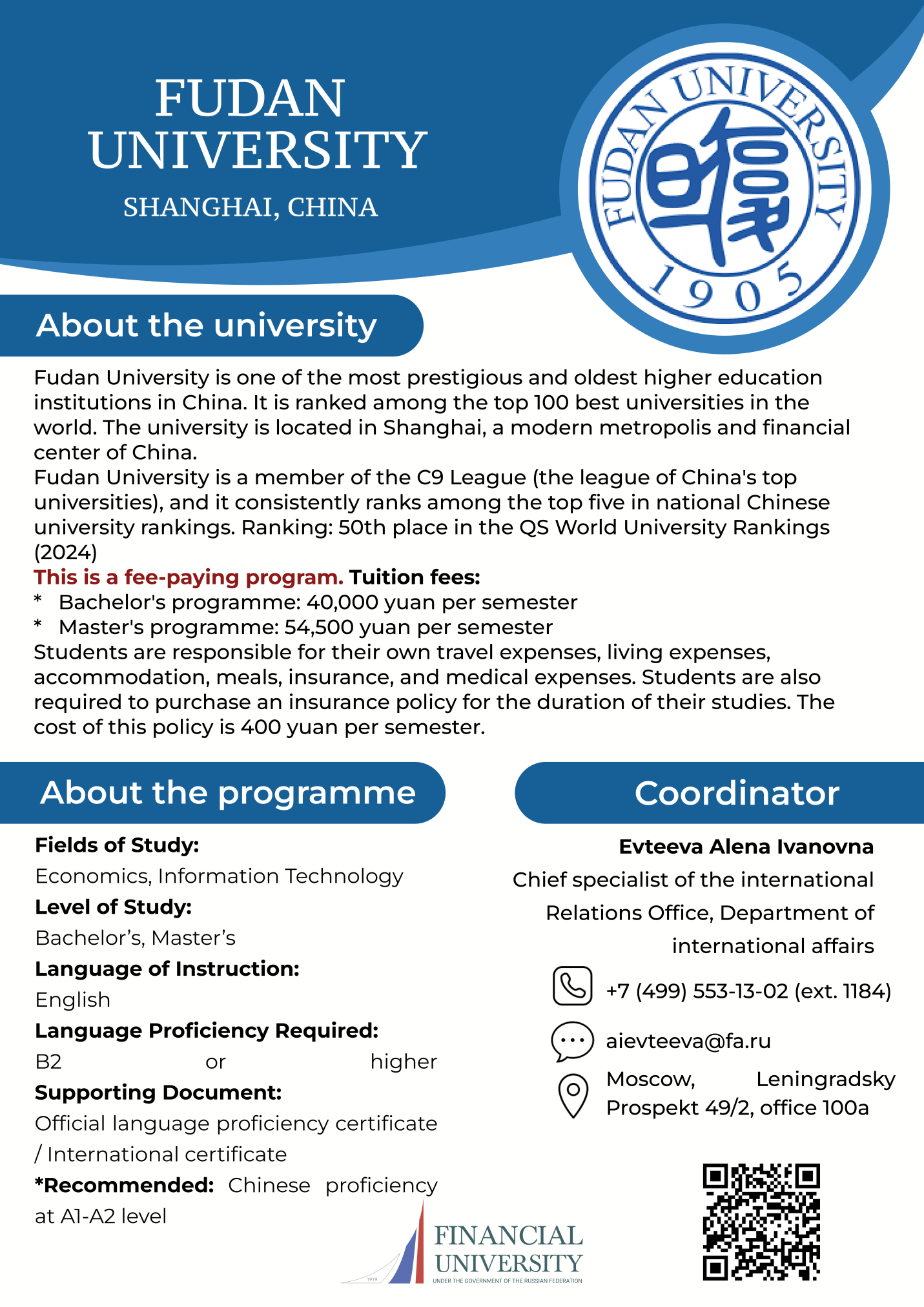 | International Energy Business Partner University: Fudan University (China)Target Audience: 1st year Master's students of FMEO Language of Instruction: English Tuition Fee: Paid Deadline: to be specified Academic Coordinator: Amurskaya Marina Alexandrovna, Head of the Department of International Business +7 (499) 943-9493 MAAmurskaya@fa.ru Administrative Coordinator: Alyona Ivanovna Evteeva, Chief Specialist of the International Relations Department of the International Activities Directorate +7 (499) 553-1302 AIEvteeva@fa.ru Fudan University (PDF) |
