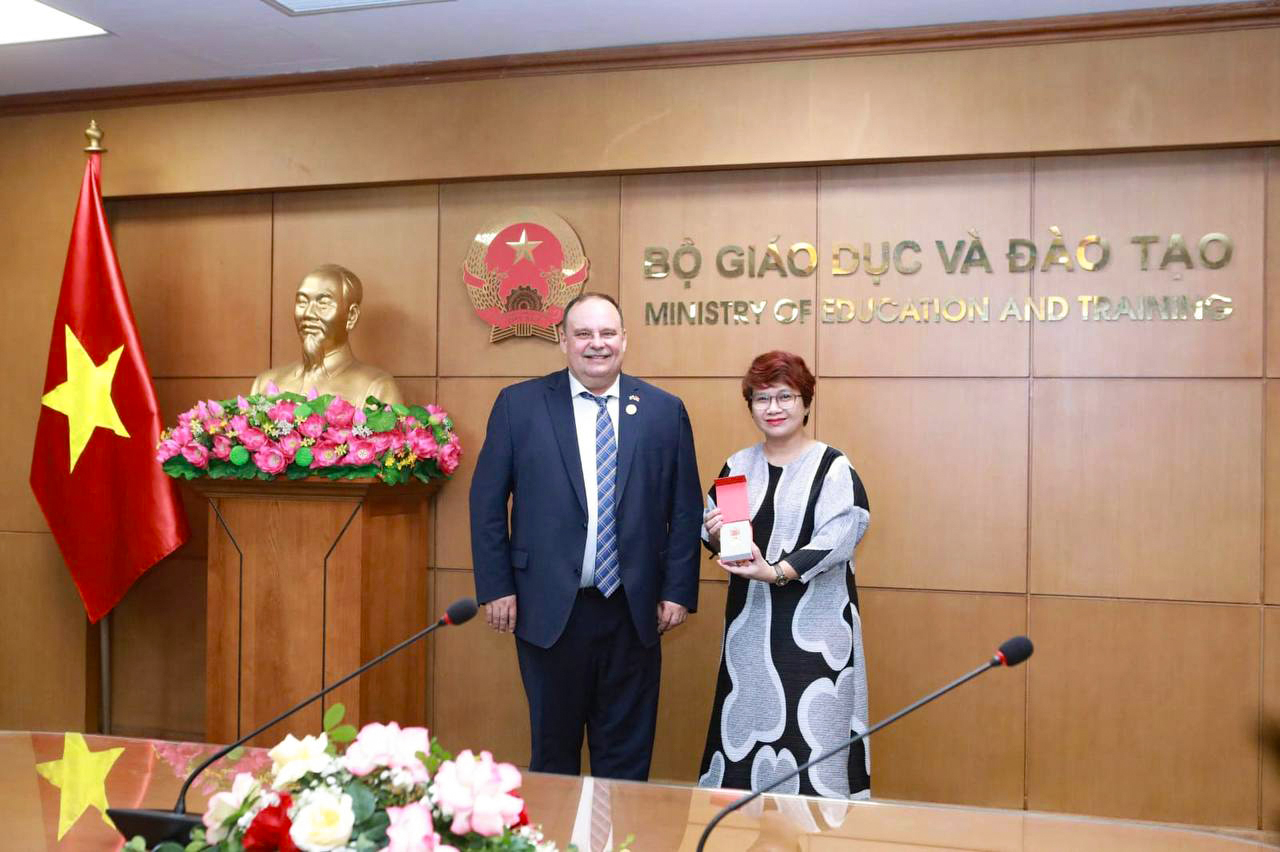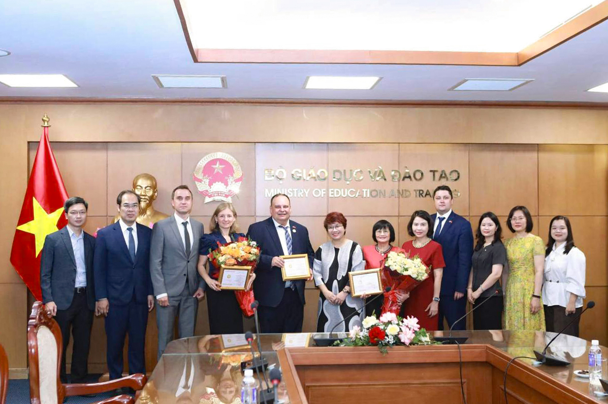 Nguyen Thu Thuy, Director of the International Department of the Ministry of Education and Training of the Socialist Republic of Vietnam, presented the commemorative medal of the Ministry of Education and Training of the SRV for contributions to the development of education in Vietnam to Financial University Rector Stanislav Prokofiev. The Ministry's awards for contributions to the development of education in Vietnam were also given to Lilia Prihodko, Deputy Dean for Relations with Russian and International Partners at the university's Faculty of Finance, and To Thi Tuyet Khanh, Ambassador of Russian Education in Vietnam and Chief Specialist of the Financial University's Department of International Activities.